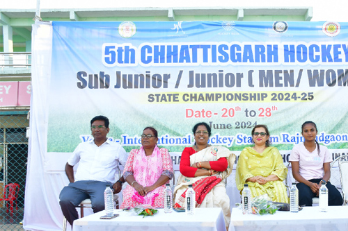 संस्कारधानी एवं देश में हॉकी के नर्सरी के नाम से पहचान बना चुके छत्तीसगढ़ की खेल राजधानी राजनांदगांव के अंतर्राष्ट्रीय एस्ट्रोटर्फ स्टेडियम में आज से प्रारंभ हुई 5वीं जूनियर बालक-बालिकाओं की हॉकी प्रतियोगिता 24 जून 2024 से 28 जून 2024 तक आयोजित किया जा रहा है। स्पर्धा के पहले दिन बालिका वर्ग में प्रातः से खेले गए मैच में हॉकी रायगढ़ ने स्पोटर्स हॉकी अकादमी रायपुर को 4-1 गोलों से पराजित करते हुए विजयी अभियान प्रारंभ किया। हॉकी रायगढ़ के खिलाड़ियों ने शानदार खेल का प्रदर्शन करते हुए मैच के 9वें मिनट, 27वें मिनट व 57वें मिनट कनक महेश्वरी ने 3 गोल, काजल यादव ने 1 गोल, व रायपुर की ओर से एक मात्र गोल शैली सोनी ने किया। बालिका वर्ग में खेले गए आज दूसरे मैच में हॉकी दुर्ग ने जांजगीर चांपा को 4-0 गोल से पराजित किया। हॉकी दुर्ग ने शुरूवाती समय में ही मैच के 2रे मिनट में ही गोल करते हुए मैच 1-0 गोल की बढत बनाई हुई थी। हॉकी दुर्ग ने अच्छे खेल का प्रदर्शन करते करते हुए हॉकी दुर्ग की ओर से मैच के 27वें मिनट, 33वें मिनट और 47वें मिनट में गौरी देवांगन, भुमिका वर्मा ने 1-1 गोल, वहीं अक्शा प्रवीन ने 2 गोल किया। बालिका वर्ग में खेले गए तीसरे मैच में हॉकी बिलासपुर ने एकतरफे मुकाबले में हॉकी बेमेतरा को 21-0 गोलों से पराजित किया। हॉकी बिलासपुर की ओर से जन्हावी यादव ने 8 गोल मधु सिदार ने 4 गोल अंजली बंजारे ने 3 गोल और मेमतेश्वरी लहरे, डॉली निषाद ने 2-2 और अक्षिता अहूजा, दामिनी खुसरो ने 1-1 गोल किए। स्पर्धा के पहले ही हॉकी बिलासपुर की टीम ने सर्वाधिक गोल किया है।