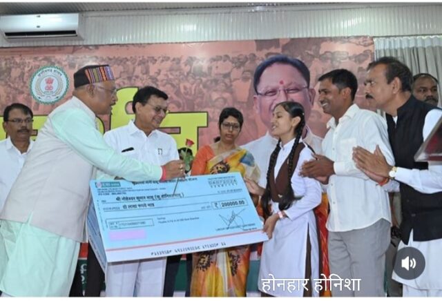 गरियाबंद। इस वर्ष दसवी बोर्ड परीक्षा में मेरिट सूची में अपना दर्ज कराकर जिले का नाम रोशन करने वाली होनहार छात्रा होनिशा साहू अब अपनी खुद की स्कूटी ले सकेंगी।साथ ही प्रशासनिक अधिकारी बनने के अपने सपने को भी पूरा कर सकेंगी।मुख्यमंत्री विष्णु देव साय ने आज अपने निवास में आयोजित जनदर्शन कार्यक्रम में होनिशा को दो लाख रूपये का चेक सौपा।मुख्यमंत्री ने श्रम विभाग की मुख्यमंत्री नोनी बाबू मेधावी शिक्षा सहायता योजना के तहत राज्य के अन्य 12 विद्यार्थियों को दो-दो लाख रुपए के चेक प्रदान किए और उन्हें उज्ज्वल भविष्य के लिए आशीर्वाद प्रदान किया। मुख्यमंत्री के हाथों सम्मानित होने और उन्हें राशि मिलने से होनिशा सहित सभी बच्चे उत्साहित हो गये। उन्हें मिले सम्मान और सहायता राशि से उनका आत्मविश्वास भी बढ़ गया।दसवीं की बोर्ड परीक्षा में दूसरा स्थान प्राप्त करने वाली होनिशा डिप्टी कलेक्टर बनना चाहती हैं। मुख्यमंत्री के हाथों मिले राशि से आगे की पढ़ाई जारी रखकर अपना सपना साकार कर सकेंगी।