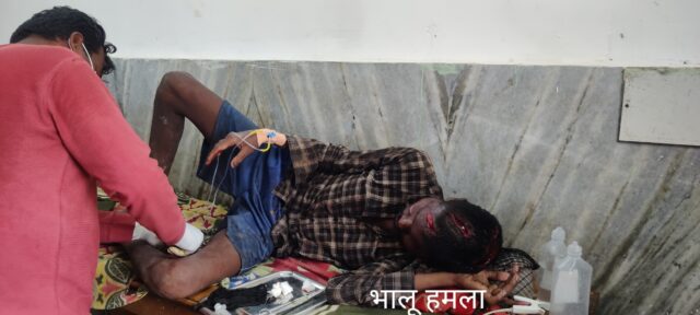 गरियाबंद। सौच के लिए जंगल गए ब्यक्ति के ऊपर हमला करने से गंभीर रूप से घायल व्यक्ति का इलाज जिला अस्पताल में प्राथमिक उपचार करते हुए रायपुर भेजा गया।जिलामुख्यालय से पांच किलोमीटर दूर ग्राम नागबूड़ा निवासी दुलेश कमार सुबह आठ बजे शौच के लिए रानी बछिया जंगल की ओर गया था उसी दौरान एक मादा भालू अपने दो बच्चों के साथ दुलेश ऊपर हमला कर दिया इस हमले से दुलेश की सिर चेहरा पीठ और जाँघ में गंभीर चोट लगी उसी दौरान नजदीक के लोगो के द्वारा हल्ला मचाते हुए भालू को भगाये और घायल व्यक्ति को गांव लेकर आए और जंगल विभाग को सूचना दिए,जानकारी मिलते ही वन विभाग की टीम मौके पर पहुँची और घायल व्यक्ति को जिला अस्पताल लेकर आए जहाँ व्यक्ति का प्राथमिक उपचार किए और गंभीर स्थिति को देखते हुए रायपुर रिफ़र करने किया गया।