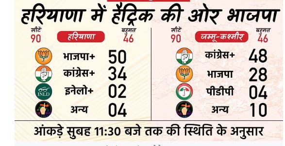 नई दिल्ली । हरियाणा और जम्मू-कश्मीर विधानसभा चुनाव के लिए वोटों की गिनती जारी है। शुरुआती रुझानों में हरियाणा में भाजपा ने बहुमत का आंकड़ा पार कर लिया है। इस तरह हरियाणा में भाजपा की हैट्रिक लगने की उम्मीद बन गई है। वहीं जम्मू कश्मीर में कांग्रेस गठबंधन आगे चल रहा है। दोनों राज्यों के चुनाव नतीजों पर इसलिए भी नजर है क्योंकि ये नतीजे आगामी राज्यों के चुनाव पर भी असर डाल सकते हैं। जम्मू कश्मीर में 90 सीटों के लिए तीन फेज में वोटिंग हुई थी। वहीं हरियाणा में सिर्फ एक फेज यानी 5 अक्तूबर को मतदान हुआ था। जम्मू-कश्मीर कांग्रेस अध्यक्ष तारिक हमीद कर्रा ने चुनाव रुझानों पर कहा, ‘मैं बहुत खुश हूं, मैं कहता रहा हूं कि हम 50 से ज्यादा सीटें जीतेंगे। मैं अभी भी उम्मीद कर रहा हूं कि अंतिम परिणाम भी इसी के अनुरूप होंगे। हम एक स्थिर और समावेशी सरकार चाहते हैं, जिसके जरिए हम एक नया संघर्ष शुरू कर सकें जो और भी मजबूत तरीके से आगे बढ़ेगा। कोई भी व्यक्ति या कोई भी राजनीतिक दल जो भाजपा को सत्ता के गलियारे से दूर रखने के पक्ष में है, उसका हार्दिक स्वागत है।’ रुझानों में जम्मू कश्मीर में कांग्रेस-नेकां गठबंधन बहुमत का आंकड़ा पार कर चुका है। कांग्रेस गठबंधन 48 सीटों पर आगे है। वहीं भाजपा 28 सीटों पर, पीडीपी 4 सीटों पर आगे है। अन्य 10 सीटों पर आगे चल रहे हैं।