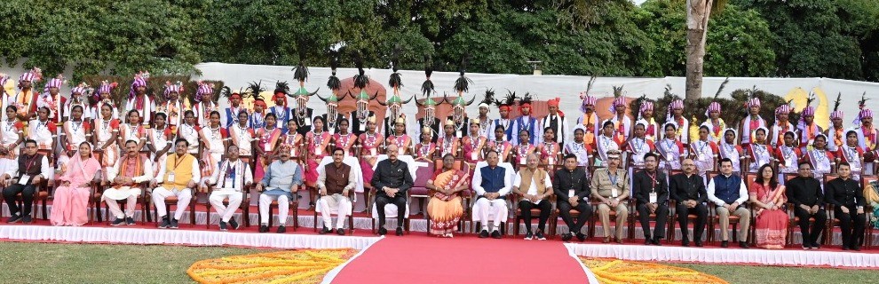 राष्ट्रपति श्रीमती द्रौपदी मुर्मु छत्तीसगढ़ के जनजातीय समुदायों के लोग अपनी जीवन-पद्धति, खान-पान, लोक-नृत्य, लोक-संगीत, लोकवाद्यों, कलाओं रीति-रिवाजों, तीज-त्यौहारों, अस्थाओं और अन्य आदिम परंपराओं से काफी प्रभावित हुईं। छत्तीसगढ के पारंपरिक वेषभूषा में सजे आदिवासियों के साथ सामुहिक छायाचित्र लिया गया।