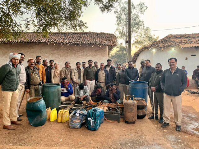 दुर्ग। कलेक्टर दुर्ग सुश्री ऋचा प्रकाश चौधरी के दिशा-निर्देश व प्रभारी सहायक आयुक्त आबकारी सी. आर. साहू के मार्गदर्शन में 21 जनवरी को प्रातः गश्त के दौरान अवैध शराब के निमार्ण, विक्रय एवं धारण की सूचना प्राप्त होने पर त्वरित एवं विधिवत् कार्यवाही कर ग्राम घटियाखुर्द थाना नंदिनी नगर जिला दुर्ग में आरोपी 1. राहुल पारधी 2. नागेश्वर पारधी 3. अनिकेत पारधी 4. बबला पारधी 5. संजू पवार जाति पारधी 6. मुंशी राम पारधी के कब्जे से 44.64 लीटर देशी, विदेशी मदिरा, जिसका बाजार मूल्य 28000 रूपये है, 43 लीटर कच्ची मदिरा गुड़ निर्मित, जिसका बाजार मूल्य 6400 रूपये है एवं 500 किलेग्राम लाहन, जिसका बाजार मूल्य 25000 रूपये है तथा भारी मात्रा में मदिरा निर्माण सामाग्री गैस, चूल्हा, डेचकी आदि जप्त किया गया, जिसका बाजार मूल्य लगभग 10000 रूपये है। इस प्रकार जप्त मदिरा एवं सामग्रियों का कुल बाजार मूल्य लगभग 69400 रूपये है। उक्त प्रकरण में आरोपियों के विरूद्ध आबकारी अधिनियम की धारा 34(2), 59(क) एवं 34(1)(ख) के तहत प्रकरण दर्ज कर 05 आरोपियों को जेल दाखिला किया गया तथा 01 आरोपी मुंशी राम पारधी के विरूद्ध 34(1)(ख) प्रकरण कायम कर विवेचना में लिया गया है।
