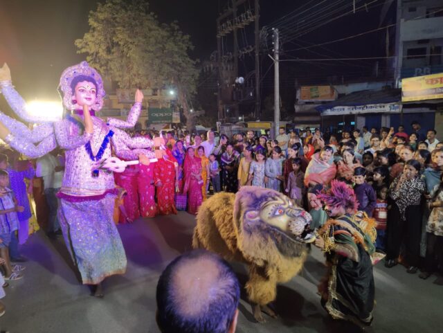 शोभायात्रा सँध्या 5 बजे मां दुर्गा मंदिर से प्रारंभ की गयी जिसमें सबसे पहले माता के दरबार के सामने सभी बाजा ग्रुप ने अपनी अपनी प्रस्तुति दी फिर शोभायात्रा प्रारंभ हुई.