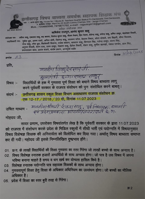 निःशुल्क और अनिवार्य बाल शिक्षा का अधिकार अधिनियम 2009 के द्वारा भी मिडिल स्तर पर विषय विशेषज्ञ शिक्षकों की नियुक्ति का प्रावधान किया गया है। पिछली सरकार द्वारा 4 मई एवं 11 जुलाई 2023 को अधिसूचना जारी कर राजपत्र में संशोधन करते हुए मिडिल स्कूलों में शिक्षक पद पर पदोन्नति एवं भर्ती में विषय बंधन को समाप्त कर दिया गया। इससे मिडिल स्कूलों के सेटअप में अनेक प्रकार की विसंगतियां उत्पन्न हो गयी हैं। विषय बंधन नहीं होने के कारण ऐसे कई स्कूल हैं, जहां एक ही विषय के एक से अधिक शिक्षक कार्यरत हैं, वहीं दूसरी ओर दूसरे विषय के शिक्षक ही पदस्थ नहीं हैं, इससे अन्य विषयों का अध्यापन गंभीर रूप से प्रभावित हो रहा है। बच्चे अपने विद्यालय में समस्त विषयों के विषय विशेषज्ञ शिक्षकों के नही होने से गुणवत्तापूर्ण शिक्षा से वंचित हो रहे हैं। दूसरी ओर राज्य सरकार द्वारा संचालित स्वामी आत्मानंद मिडिल स्कूलों में विषयवार शिक्षकों की भर्ती हो रही है। केंद्र सरकार द्वारा संचालित पीएमश्री स्कूल, केंद्रीय विद्यालय एवं जवाहर नवोदय विद्यालयों में भी मिडिल स्तर पर विषयवार शिक्षकों की पदोन्नति एवं भर्ती का प्रावधान है।