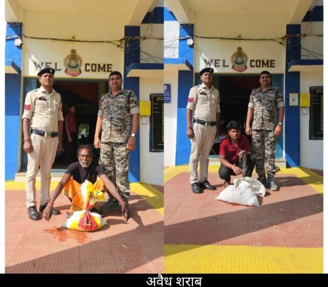 गरियाबंद। नशे के विरुद्ध *नया सवेरा* अभियान अंतर्गत वरिष्ठ अधिकारियों के द्वारा समस्त थाना प्रभारी को अपने-अपने थाना क्षेत्र अंतर्गत नशे के विरुद्ध विशेष अभियान चला कर अवैध रूप से शराब बिक्री एवं परिवहन करने वालों के विरुद्ध कड़ी कार्रवाई निर्देश दिए थे।जिसके परिपालन में समस्त थाना प्रभारी अपने अपने थाना क्षेत्र अंतर्गत मुखबिर सक्रिय किया गया था।9 व 10 मई को दो अलग अलग मामलें अपराध क्रमांक 128/2025 धारा 34(2) छ0ग0 आब0 एक्ट के प्रकरण में घटना स्थल ग्राम लक्ष्मी चौक के पास ग्राम खम्हारगुड़ा से आरोपी बेनुराम यादव पिता दशरु यादव उम्र 59 वर्ष निवासी खम्हारगुड़ा थाना देवभोग जिला के द्वारा अवैध रूप से उड़िसा प्रांत निर्मित डबल लाल घोड़ा छाप कच्ची महुआ शराब बिक्री करने हेतु पैदल परिवहन करते पाये जाने पर आरोपी के कब्जे से उड़िसा प्रांत निर्मित डबल लाल घोड़ा छाप कच्ची महुआ शराब 30 नग प्रत्येक में 200 एमएल भरा हुआ कुल जुमला 6 लीटर किमती 750 रूपये को जप्त किया गया। इसी तरह दुसरे प्रकरण अपराध क्रमांक 129/2025 धारा 34(2) छ0ग0 आब0 एक्ट में घटना स्थल उधोराम कष्यप का खेत कच्ची रास्ता के मध्य ग्राम सागौनबाड़ी से खम्हारगुड़ा के पास आरोपी धर्मराज यादव पिता बेनुराम यादव उम्र 22 वर्ष निवासी खम्हारगुड़ा थाना देवभोग के अवैध रूप से उड़िसा प्रांत निर्मित डबल लाल घोड़ा छाप कच्ची महुआ शराब बिक्री करने हेतु छीपाकर रखे पाये जाने पर आरोपी के कब्जे से उड़िसा प्रांत निर्मित डबल लाल घोड़ा छाप कच्ची महुआ शराब 75 नग प्रत्येक में 200 एमएल भरा हुआ कुल जुमला 15 लीटर किमती 1875 रूपये जप्त किया गया। उक्त दो प्रकरणों में कुल जुमला 21 बल्क लीटर उड़िसा प्रांत निर्मित डबल लाल घोड़ा छाप कच्ची महुआ शराब के साथ दो आरोपियों को समक्ष गवाहन के गिरफ्तार कर अलग अलग प्रकरण में न्याय हिरासत में भेजा गया।
