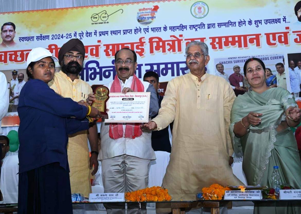 बिल्हा को देश का सबसे स्वच्छ शहर बनाने वाले स्वच्छता दीदियों और सफाई कर्मियों को उप मुख्यमंत्री अरुण साव ने किया सम्मानित
