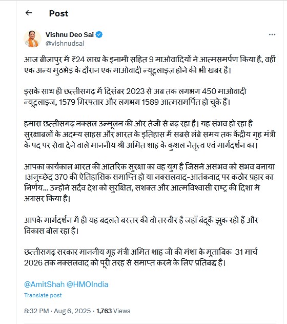 मुख्यमंत्री ने स्पष्ट किया कि छत्तीसगढ़ सरकार प्रधानमंत्री नरेंद्र मोदी और केंद्रीय गृह मंत्री अमित शाह की मंशा के अनुरूप 31 मार्च 2026 तक राज्य से नक्सलवाद को पूरी तरह समाप्त करने के लिए पूरी तरह प्रतिबद्ध है।