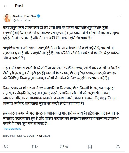 मुख्यमंत्री श्री साय ने जिला प्रशासन को निर्देश दिए हैं कि घटना में हुई जनहानि के लिए शासकीय नियमों के अनुरूप अनुग्रह सहायता स्वीकृति का प्रस्ताव शीघ्र तैयार किया जाए। प्रभावित परिवारों को अस्थायी आश्रय, खाद्यान्न और अन्य आवश्यक सामग्री उपलब्ध कराई जाए। साथ ही मकान, फसल और पशुहानि का विस्तृत सर्वे कर शीघ्र राहत सुनिश्चित की जाए।