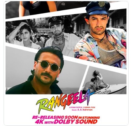 राम गोपाल वर्मा ने अपने एक्स अकाउंट पर फिल्म का एक पोस्टर जारी करते हुए ‘रंगीला’ की री-रिलीज के बारे में जानकारी दी है। अपनी पोस्ट में रामू ने लिखा है, ‘रंगीला 4K डॉल्बी में री-रिलीज हो रही है। आमिर खान, जैकी श्रॉफ, उर्मिला मातोंडकर और एआर रहमान को इसके लिए बधाई। रंग फिर से वापस आ रहे हैं।’ अपनी इस पोस्ट में राम गोपाल वर्मा ने ‘रंगीला’ का एक पोस्टर भी शेयर किया है, जिसमें फिल्म के अलग-अलग सीन नजर आ रहे हैं। इस पोस्टर में फिल्म की पूरी लीड कास्ट भी दिख रही है।