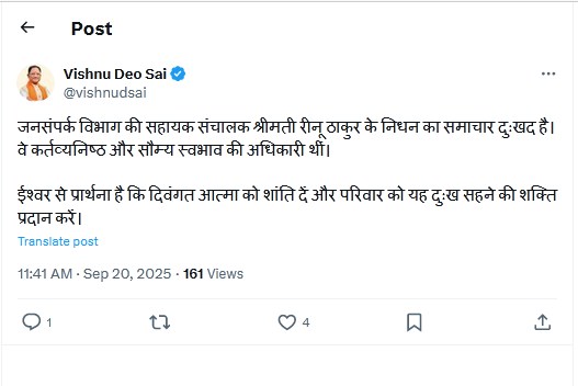 रायपुर- मुख्यमंत्री विष्णुदेव साय ने जनसंपर्क विभाग की सहायक संचालक श्रीमती रीनू ठाकुर के निधन पर गहरी संवेदना व्यक्त की है।