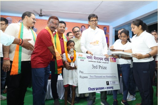 वित्त मंत्री ओ.पी.चौधरी ने नमो मैराथन दौड़ के समापन में विजयी प्रतिभागियों को पुरस्कृत किया। इनमें पुरूष वर्ग में प्रथम स्थान पर मनोज कुमार यादव, द्वितीय-भोजराम साहू एवं तृतीय स्थान पर सुनील कुमार साहू रहे। इसी तरह महिला वर्ग में प्रथम स्थान पर सोना चौहान, द्वितीय-संगीता यादव एवं तृतीय स्थान पर धनकुवर सिदार रही। प्रथम आने वाले प्रत्येक प्रतिभागी को 5100 रूपए, द्वितीय को 3100 रुपए एवं तृतीय स्थान पर रहे प्रतिभागियों को 2100 रुपए दिए गए। बालक और बालिका वर्ग से प्रथम दस स्थानों पर आने वाले प्रतिभागियों को वित्त मंत्री ओ.पी.चौधरी ने 5-5 हजार रूपये देने की घोषणा भी की।