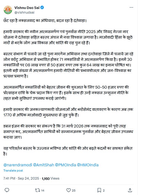 रायपुर- मुख्यमंत्री विष्णु देव साय ने कहा कि राज्य सरकार की नवीन आत्मसमर्पण एवं पुनर्वास नीति 2025 और नियद नेल्ला नार योजना ने दंतेवाड़ा सहित पूरे बस्तर अंचल में नया विश्वास जगाया है। माओवादी हिंसा के झूठे नारों से भटके लोग अब विकास और शांति की राह चुन रहे हैं।