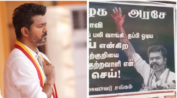 तमिलनाडु छात्र संघ की ओर से जो पोस्टर्स लगाए गए हैं, उनमें विजय की एक तस्वीर है, जिसमें उनके हाथ खून से सने हैं। इसके साथ ही पोस्टर पर लिखा है, ‘39 निर्दोष जीवन का बलिदान, पलायन और नाम रखा विजय। मुझे राजनीतिक संबद्धता के कारण हत्यारे के रूप में गिरफ्तार करो।’
