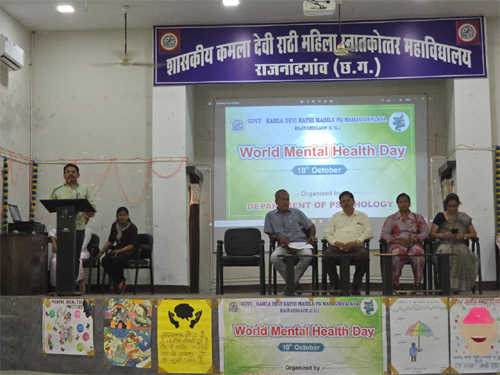 राजनांदगांव। शासकीय कमलादेवी राठी महिला स्नातकोत्तर महाविद्यालय, राजनांदगांव में 10 अक्टूबर 2025 को विश्व मानसिक स्वास्थ्य दिवस के उपलक्ष्य में विविध जागरूकता कार्यक्रमों का आयोजन किया गया। मनोविज्ञान विभाग के तत्वावधान में आयोजित इन कार्यक्रमों में छात्राओं ने बढ़-चढ़कर हिस्सा लिया।