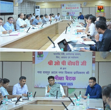 रायपुर- नवा रायपुर अटल नगर विकास प्राधिकरण में आज वित्त, आवास एवं पर्यावरण मंत्री ओ.पी. चौधरी की अध्यक्षता में निवेश, अधोसंरचना विकास और जनसुविधाओं से संबंधित कार्यों की प्रगति की समीक्षा बैठक आयोजित हुई।