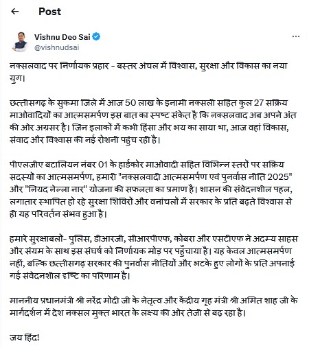 मुख्यमंत्री श्री साय ने कहा कि प्रधानमंत्री नरेंद्र मोदी जी के नेतृत्व और केंद्रीय गृह मंत्री अमित शाह जी के मार्गदर्शन में भारत ‘नक्सल मुक्त राष्ट्र’ के लक्ष्य की ओर तीव्र गति से बढ़ रहा है। छत्तीसगढ़ सरकार इस राष्ट्रीय संकल्प में पूरी निष्ठा और समर्पण के साथ अग्रसर है।