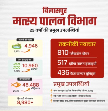 वर्ष 2000 में जब छत्तीसगढ़ राज्य का गठन हुआ, उस समय बिलासपुर जिले में मछली पालन मुख्यतः पारंपरिक विधियों तक सीमित था। ग्रामीण क्षेत्रों में मत्स्य पालन एक सहायक आजीविका के रूप में देखा जाता था। केवल 3 हजार 333 तालाब मछली पालन के लिए पट्टे पर दिए गए थे और मत्स्य उत्पादन 21 हजार 120 मीट्रिक टन था। विगत 25 वर्षों में मत्स्य पालन विभाग, बिलासपुर ने योजनाबद्ध प्रयासों और नवाचारों के माध्यम से इस क्षेत्र को नई दिशा दी है। आज जिले में 4 हजार 946 तालाब मछली पालन के लिए उपयोग में हैं। पट्टे पर जल क्षेत्र की सीमा 5 हजार 679 हेक्टेयर से बढ़कर 10 हजार 960 हेक्टेयर तक पहुँच गई है। ग्रामीण तालाबों की संख्या 227 से बढ़कर 4 हजार 884 हो चुकी है। इस विस्तार का सबसे बड़ा प्रभाव मत्स्य उत्पादन पर पड़ा है, जो अब 48 हजार 488 मीट्रिक टन तक पहुँच गया है।