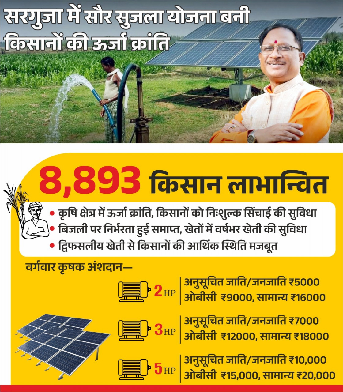 रायपुर / छत्तीसगढ़ शासन की सौर सुजला योजना खेती में ऊर्जा की बाधा दूर कर ग्रामीण अर्थव्यवस्था को सशक्त बना रही है। सूर्य ऊर्जा आधारित सिंचाई पंपों की स्थापना से किसानों को अब निर्बाध सिंचाई सुविधा मिल रही है, जिससे खेती का रकबा बढ़ा है और किसानों की आमदनी में लगातार वृद्धि हो रही है। वर्ष 2016-17 से प्रारंभ इस योजना के अंतर्गत सरगुजा जिले के 8893 किसानों को अब तक सौर पंपों का लाभ प्राप्त हुआ है। इन पंपों से किसानों की बिजली पर निर्भरता समाप्त हुई है, लागत घटी है और उत्पादन क्षमता बढ़ी है। उप संचालक कृषि श्री पीताम्बर सिंह दीवान ने बताया कि सौर पंप मिलने से वर्षभर सिंचाई संभव हो पाई है, जिससे द्विफसली और बहुफसली खेती का दायरा बढ़ा है। सौर सुजला योजना का लाभ लेने के लिए किसान के पास कम से कम 1 एकड़ भूमि होना आवश्यक है। इच्छुक किसान बी-1, खसरा, आधार कार्ड, बैंक पासबुक, दो पासपोर्ट फोटो, जल स्त्रोत का फोटो, सरपंच की अनापत्ति प्रमाण पत्र और जाति प्रमाण पत्र सहित अपने क्षेत्रीय ग्रामीण कृषि विस्तार अधिकारी को आवेदन प्रस्तुत कर सकते हैं। किसानों के लिए 2 एचपी, 3 एचपी और 5 एचपी क्षमता के सौर पंप उपलब्ध कराए जा रहे हैं, जिन पर वर्गवार अंशदान निर्धारित है। 2 एचपी पंप पर अनुसूचित जनजाति एवं अनुसूचित जाति किसानों का अंशदान 5000 रुपए, अन्य पिछड़ा वर्ग का 9000 रुपए और सामान्य वर्ग का 16000 रुपए है। 3 एचपी पंप पर अनुसूचित जनजाति एवं अनुसूचित जाति ₹7000, अन्य पिछड़ा वर्ग ₹ 12000 और सामान्य वर्ग 18000 रुपए, वहीं 5 एचपी पंप पर अनुसूचित जनजाति एवं अनुसूचित जाति 10000, अन्य पिछड़ा वर्ग 15000 और सामान्य वर्ग 20000 रुपए अंशदान देय है। इसके अतिरिक्त 4800 रुपए प्रोसेसिंग शुल्क जमा करना होता है। लखनपुर विकासखण्ड के ग्राम ईरगंवा निवासी कृषक श्री लबेद सिंह ने बताया कि पहले वे अपनी 2.665 हेक्टेयर भूमि में केवल धान की खेती कर पाते थे, लेकिन सौर पंप लगवाने के बाद अब वे धान के साथ दलहन, तिलहन, सब्जियां, फलदार वृक्ष और फूलों की खेती भी कर रहे हैं। साथ ही मछली पालन से उनकी आय में और वृद्धि हुई है। उन्होंने कहा कि सौर सुजला योजना से उनका कृषि व्यवसाय मजबूत हुआ है और वे शासन के प्रति आभार व्यक्त करते हैं। सौर सुजला योजना की निरंतर प्रगति से सरगुजा सहित प्रदेश के अन्य जिलों में कृषि उत्पादन, रोजगार और ग्रामीण अर्थव्यवस्था को नई ऊर्जा और दिशा मिल रही है।