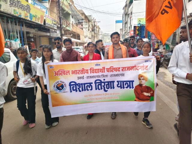 राजनांदगांव। भारत माता के प्रति समर्पण और राष्ट्रभक्ति की भावना को जन-जन तक पहुँचाने के उद्देश्य से अखिल भारतीय विद्यार्थी परिषद (एबीवीपी) राजनांदगांव इकाई द्वारा वंदे मातरम् के 150 वर्ष पूरे होने के ऐतिहासिक अवसर पर भव्य तिरंगा यात्रा का आयोजन किया गया। यह यात्रा नगर के प्रमुख मार्गों से होकर गुजरी, जिसमें सैकड़ों की संख्या में छात्र-छात्राओं, युवाओं और राष्ट्रप्रेमी नागरिकों ने उत्साह के साथ भाग लिया।