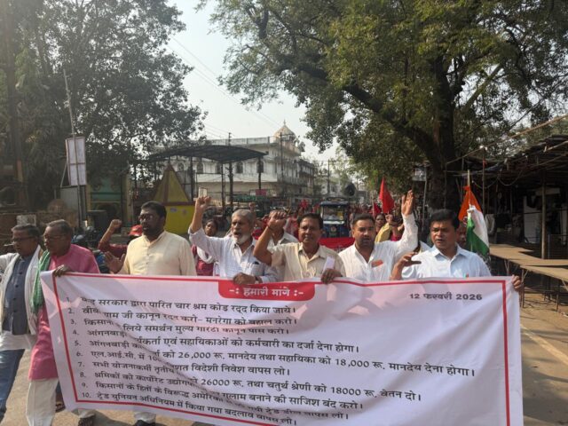 राजनांदगांव। 10 ट्रेड यूनियन और संयुक्त किसान मोर्चा की हड़ताल को कांग्रेस ने समर्थन दिया। आज कांग्रेस नेताओं ने जिला कार्यालय के सामने आयोजित प्रदर्शन में हिस्सा लिया। यहां यूनियन की सभा के उपरांत रैली निकाली गई। कांग्रेस नेताओं ने रैली में यूनियन नेताओं, श्रमिकों के साथ चलकर उनकी मांगों का समर्थन किया। कांग्रेस नेताओं ने कहा कि केंद्र सरकार की दमनकारी नीति के खिलाफ श्रमिक एकजुट हैं और कांग्रेस उनके साथ खड़ी है।