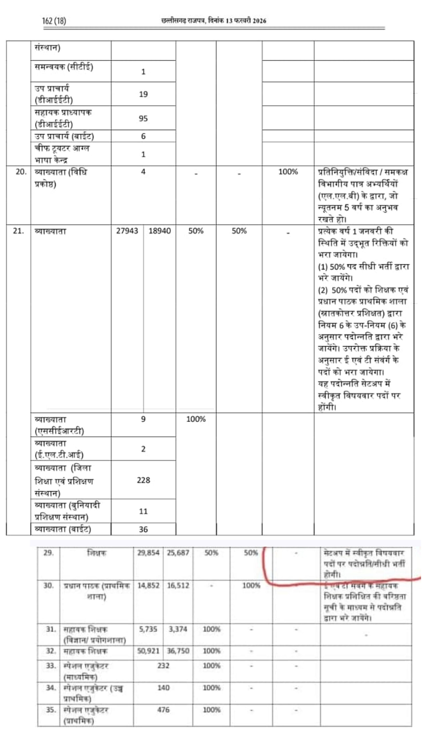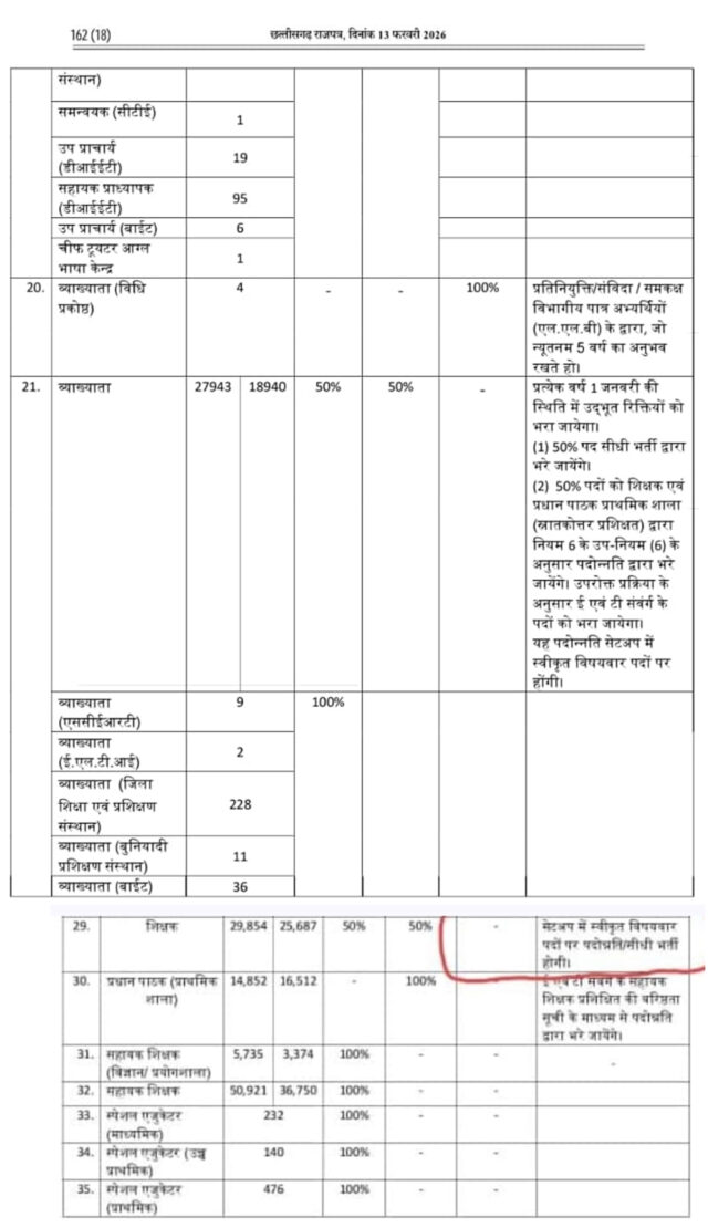 रायपुर। नयी भर्ती के नोटीफिकेशन को अब कुछ ही दिन हैं। राज्य सरकार ने इससे पहले 13/02/2026 को नवीन छत्तीसगढ़ राजपत्र ,छत्तीसगढ़ स्कूल शिक्षा सेवा (शैक्षणिक व प्रशासनिक) लागू कर दिया है। इसमे सरकारी माध्यमिक शालाओ के भर्ती व पदोन्नति मे विषयबंधन लागू कर दिया गया है, इससे बच्चो को शिक्षा गुणवत्ता मे लाभ मिलेगा वही अभ्यर्थी और सहायक शिक्षक को आपने विषयवार स्नातक विषय मे भर्ती, पदोन्नति का अवसर प्राप्त होगा,यह राजपत्र शिक्षा गुणवत्ता अभियान के लिए बडा कदम माना जा रहा है। कई अन्य संशोधन भी इस राजपत्र मे शामिल हैं।