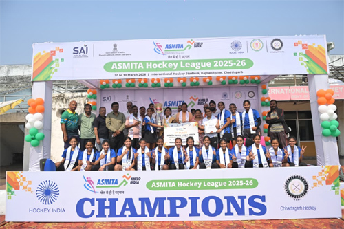 राजनांदगांव। अंतर्राष्ट्रीय एस्ट्रोटर्फ हॉकी स्टेडियम राजनांदगांव में सांई सेंटर व हॉकी इंडियाए के द्वारा संचालित व छत्तीसगढ़ हॉकी के द्वारा आयोजित अस्मिता हॉकी वेस्ट जोन लीग 2025-26 के फायनल मुकाबले में मध्यप्रदेश ने मेजबान छत्तीसगढ़ को 5-1 गोल से पराजित करते हुए स्वर्ण पदक के साथ विजेता होने का गौरव हासिल किया। मेजबान छत्तीसगढ़ रजत पदक के साथ उपविजेता व तीसरे स्थान पर हॉकी महाराष्ट्र ने कॉस्य पदक जीता।