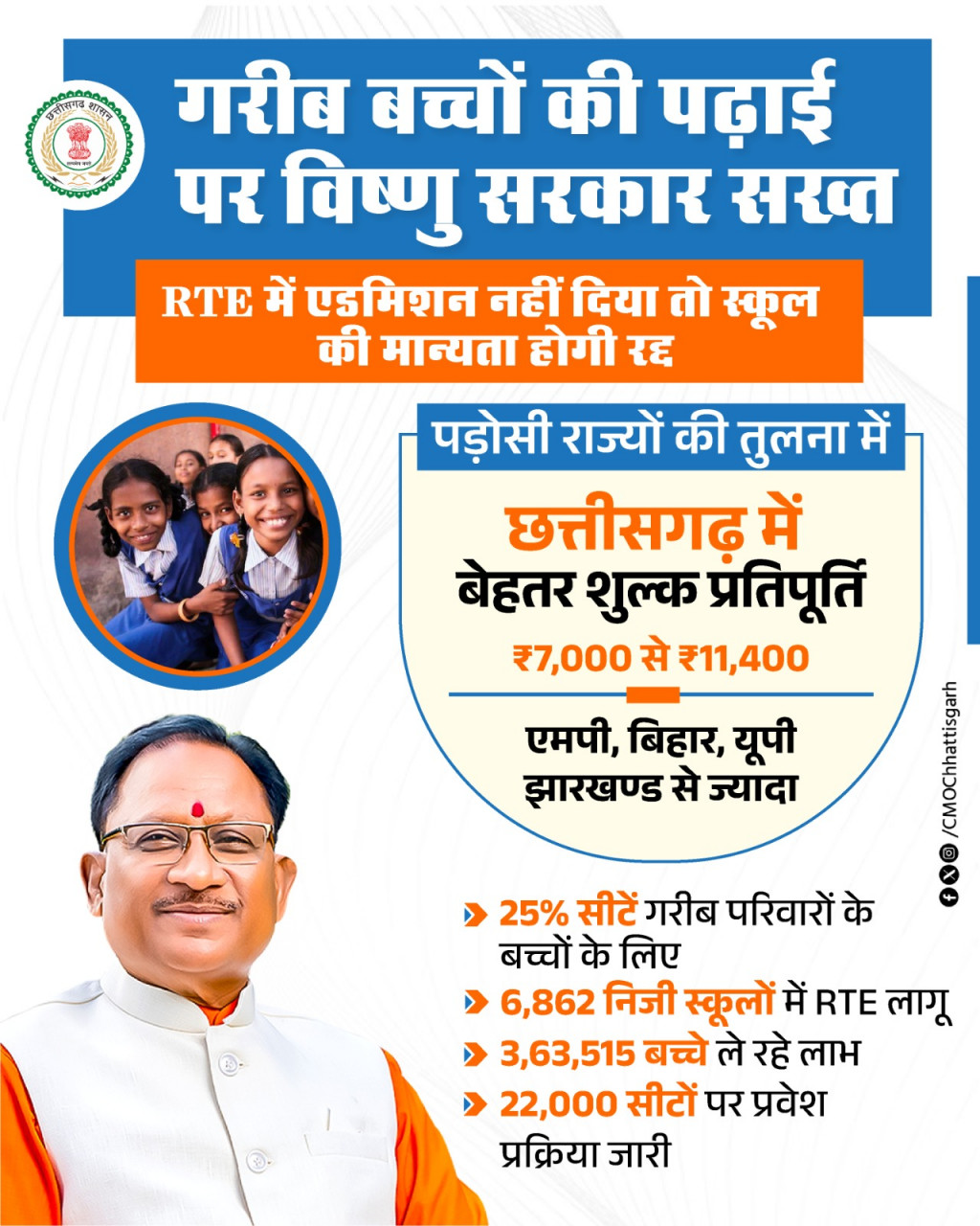 रायपुर / छत्तीसगढ़ में निःशुल्क एवं अनिवार्य बाल शिक्षा का अधिकार अधिनियम (RTE) 2009, अप्रैल 2010 से प्रभावी है। इसके अंतर्गत प्रदेश के गैर-अनुदान प्राप्त अशासकीय विद्यालयों की प्रारंभिक कक्षाओं में 25 प्रतिशत सीटें आरक्षित की गई हैं। इन सीटों पर आर्थिक रूप से कमजोर, दुर्बल वर्ग और वंचित समूह के बच्चों को उनके निवास क्षेत्र के भीतर प्रवेश दिलाया जाता है। मुख्यमंत्री श्री विष्णु देव साय के नेतृत्व में राज्य सरकार गरीब बच्चों की शिक्षा के प्रति पूरी तरह संवेदनशील है और सभी के लिए शिक्षा सुनिश्चित करने हेतु विशेष प्रयास किए जा रहे हैं।