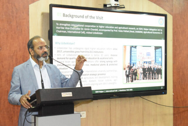 कृषि महाविद्यालय, इंदिरा गांधी कृषि विश्वविद्यालय, रायपुर में उज़्बेकिस्तान यात्रा के प्रमुख निष्कर्षों को साझा करने एवं अंतरराष्ट्रीय शैक्षणिक अवसरों को बढ़ावा देने के उद्देश्य से संगोष्ठी का आयोजन किया गया। यह कार्यक्रम विश्वविद्यालय के अंतरराष्ट्रीय शैक्षणिक सहयोग को सुदृढ़ करने के सतत प्रयासों का हिस्सा है। कार्यक्रम की शुरुआत अतिथियों के औपचारिक स्वागत के साथ हुई। तत्पश्चात अंतरराष्ट्रीय प्रकोष्ठ के अध्यक्ष प्रोफेसर हुलास पाठक ने 28 फरवरी से 10 मार्च तक माननीय कुलपति के नेतृत्व में किए गए उज़्बेकिस्तान भ्रमण के अपने अनुभव साझा किए। उन्होंने विस्तार से बताया कि इस यात्रा के दौरान कृषि, एग्रीबिजनेस, ग्रामीण विकास, उद्यमिता एवं नवाचार के क्षेत्रों में महत्वपूर्ण जानकारियाँ प्राप्त हुईं तथा भविष्य में सहयोग की व्यापक संभावनाएँ सामने आई हैं। इस संगोष्ठी का मुख्य उद्देश्य उज़्बेकिस्तान यात्रा से प्राप्त अनुभवों को, विभागाध्यक्षों, विश्वविद्यालय के प्राध्यापकों एवं विद्यार्थियों तक पहुँचाना तथा उन्हें अंतरराष्ट्रीय अवसरों के प्रति जागरूक करना था। साथ ही, छात्रों को वैश्विक स्तर पर शिक्षा, अनुसंधान एवं प्रशिक्षण के अवसरों में भागीदारी हेतु प्रेरित किया गया। कार्यक्रम के दौरान विश्वविद्यालय के शैक्षणिक एवं अनुसंधान तंत्र से संबंधित संभावित सहयोग क्षेत्रों पर भी चर्चा की गई। इसमें छात्र एवं संकाय विनिमय कार्यक्रम, संयुक्त अनुसंधान परियोजनाएँ तथा विदेशी विश्वविद्यालयों के साथ साझेदारी जैसे विषय प्रमुख रहे। संगोष्ठी में इंदिरा गांधी कृषि विश्वविद्यालय द्वारा प्रदान की जा रही वित्तीय सहायता योजनाओं की विस्तृत जानकारी दी गई। छात्रों को उड़ान योजना के तहत विदेशों में शोध एवं प्रशिक्षण के अवसरों तथा प्राध्यापकों को उत्कर्ष योजना के माध्यम से अंतरराष्ट्रीय सहयोग हेतु वित्तीय सहायता के बारे में अवगत कराया गया। इन योजनाओं का उद्देश्य आर्थिक बाधाओं को कम करते हुए अधिक से अधिक शिक्षकों एवं छात्रों को वैश्विक मंच पर अवसर प्रदान करना है। कार्यक्रम के दौरान कृषि महाविद्यालय, रायपुर की अधिष्ठाता डॉ. आरती गुहे ने छात्रों को संबोधित करते हुए उन्हें अंतरराष्ट्रीय मंच पर आगे बढ़ने तथा छत्तीसगढ़ का प्रतिनिधित्व करने के लिए प्रेरित किया। अधिष्ठाता छात्र कल्याण डॉ. संजय शर्मा ने अपने अनुभव साझा करते हुए बताया कि राष्ट्रीय एवं अंतरराष्ट्रीय अनुभव विद्यार्थियों के करियर विकास में महत्वपूर्ण भूमिका निभाता है। वरिष्ठ वैज्ञानिक डॉ. जी. के. दास ने छात्रों को अपनी क्षमता पहचानने एवं वैश्विक अवसरों का अधिकतम लाभ उठाने हेतु प्रेरित किया। कार्यक्रम मे