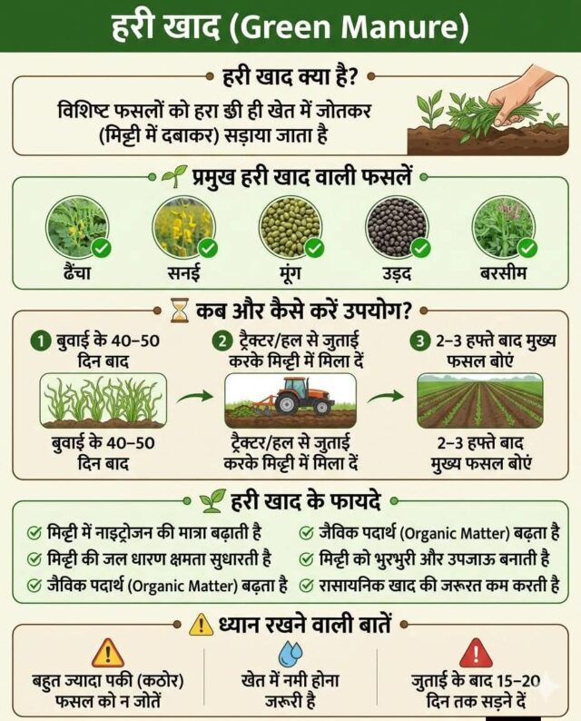कृषि विभाग के अधिाकारियों ने बताया कि हरी खाद उन फसलों को कहा जाता है जिन्हें खेत में उगाकर हरी अवस्था में ही मिट्टी में मिला दिया जाता है। ढैंचा, सन, मूंग, उड़द, लोबिया, बरसीम जैसी दलहनी फसलें इसमें प्रमुख हैं। इनकी जड़ों में मौजूद राइजोबियम जीवाणु हवा से नाइट्रोजन लेकर मिट्टी में जमा करते हैं, ठीक वैसे ही जैसे किसान महंगे यूरिया से करता है। हरी खाद का उपयोग मिट्टी के लिए किसी जीवनदायिनी संजीवनी से कम नहीं है।