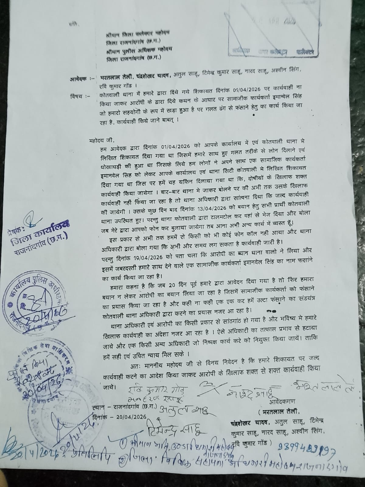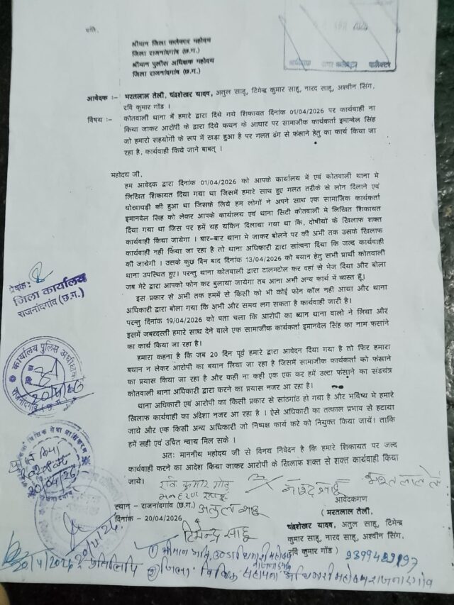 प्राप्त जानकारी के अनुसार, आवेदकगण भरत लाल तेली, चंद्रशेखर यादव, अतुल साहू, नारद साहू, अश्विनी सिंह, दुलेश्वर साहू एवं रवि कुमार गोंड द्वारा दिनांक 01 अप्रैल 2026 को कोतवाली थाना में एक लिखित शिकायत प्रस्तुत की गई थी। शिकायत में आरोप लगाया गया था कि उनके साथ धोखाधड़ी कर गलत तरीके से लेन-देन किया गया तथा विरोध करने पर उन्हें धमकाया भी गया। आवेदकों का कहना है कि, शिकायत दर्ज होने के बाद भी पुलिस द्वारा अपेक्षित कार्रवाई नहीं की गई। बार-बार थाना जाने के बावजूद केवल आश्वासन ही मिलता रहा। दिनांक 13 अप्रैल 2026 को बयान दर्ज करने के लिए बुलाया गया, किन्तु वहां भी कोई ठोस प्रगति नहीं हुई। पीड़ितों ने यह भी आरोप लगाया है कि, दिनांक 19 अप्रैल 2026 को उन्हें जानकारी मिली कि आरोपी का बयान दर्ज कर लिया गया है, जबकि मामले में एक सामाजिक कार्यकर्ता इमानवेल सिंह को अनावश्यक रूप से फंसाने का प्रयास किया जा रहा है। इससे यह संदेह उत्पन्न होता है कि, मामले में निष्पक्षता नहीं बरती जा रही है।